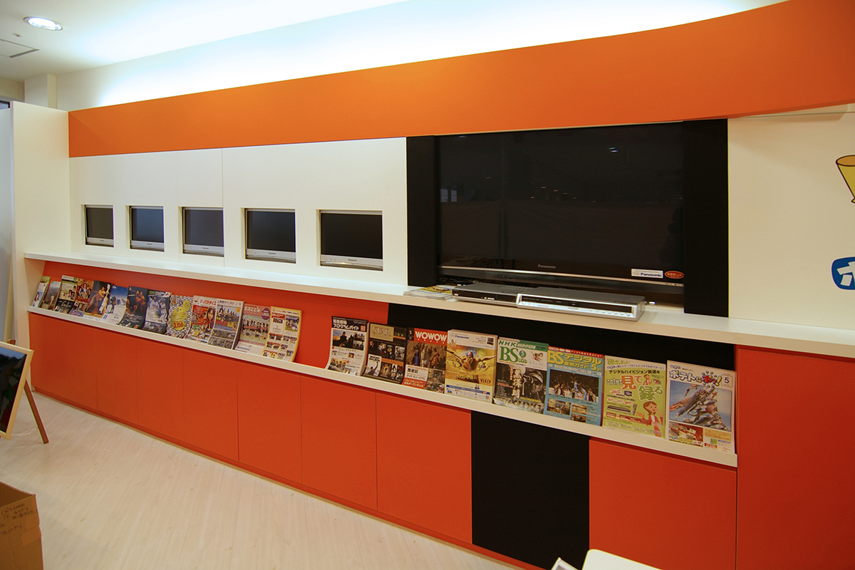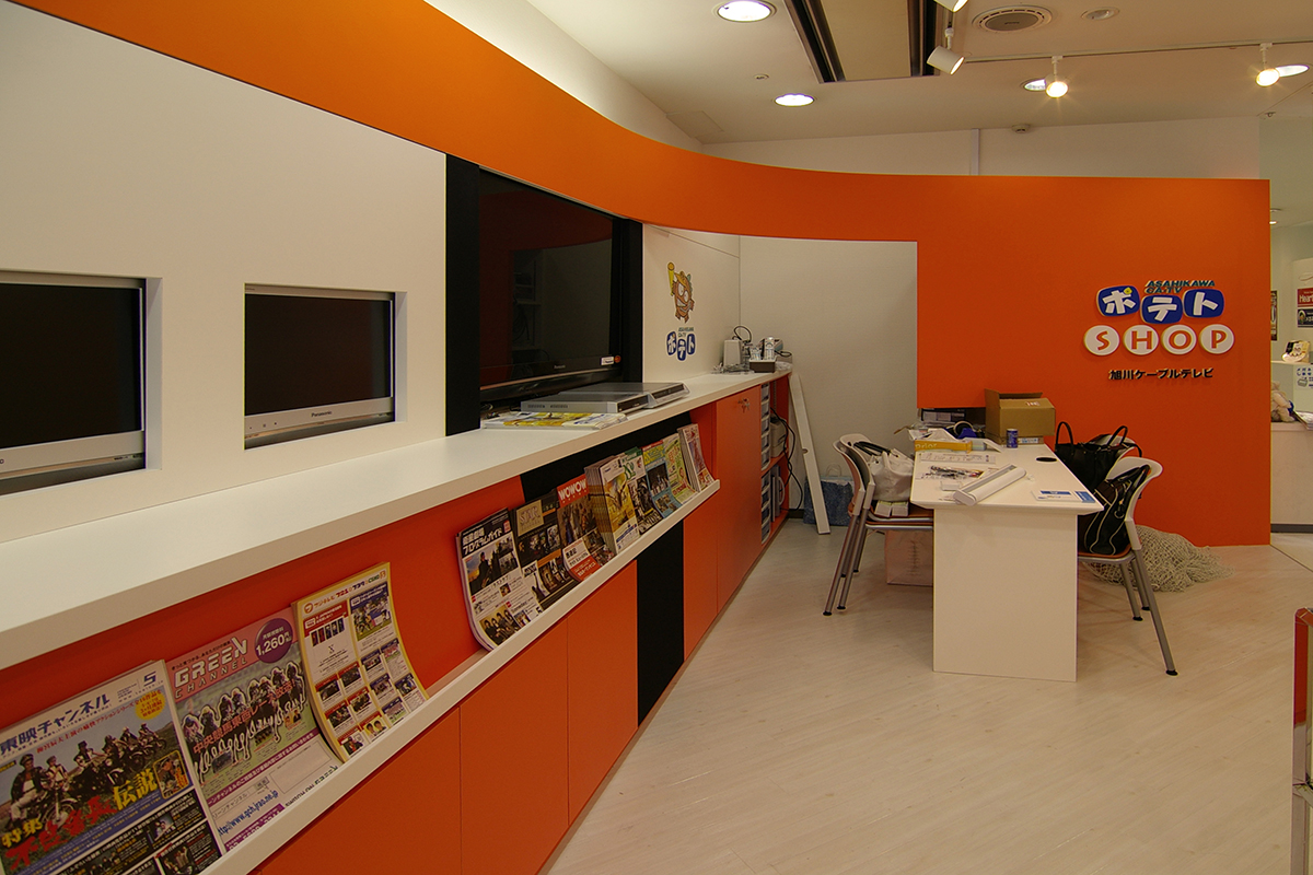 This space is designed using orange and white, the signature colors of Asahikawa Cable Television.