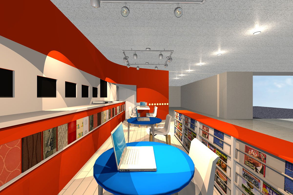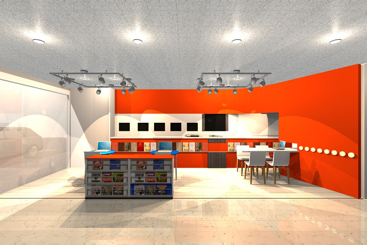 旭川ケーブルテレビのイメージカラーであるオレンジと白を基調とした空間デザインです。