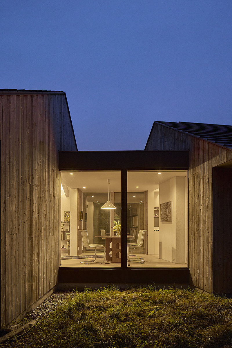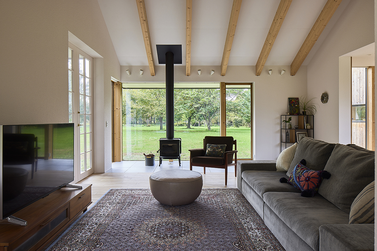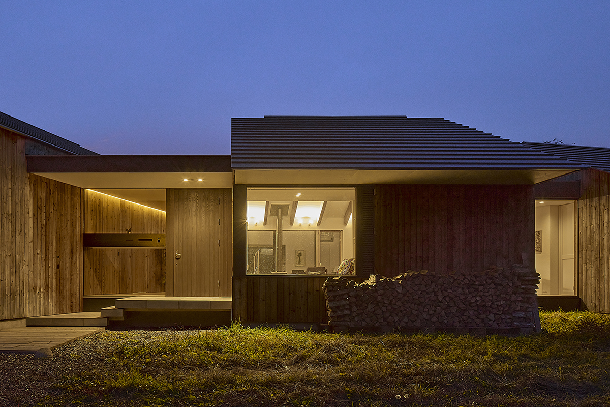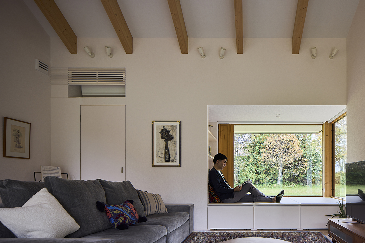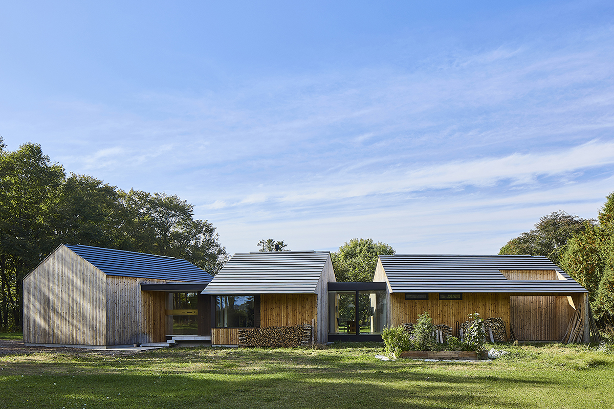 The Tokachi region is characterized by its relatively low snowfall and long hours of sunshine. Leveraging these advantages, the buildings feature triangular roofs ("Sankaku") equipped with solar panels, promoting the use of eco-friendly energy. Additionally, the structure is divided into three distinct spaces, each connected by transparent glass. This design fosters a sense of openness while seamlessly blending the living spaces with the surrounding natural environment.