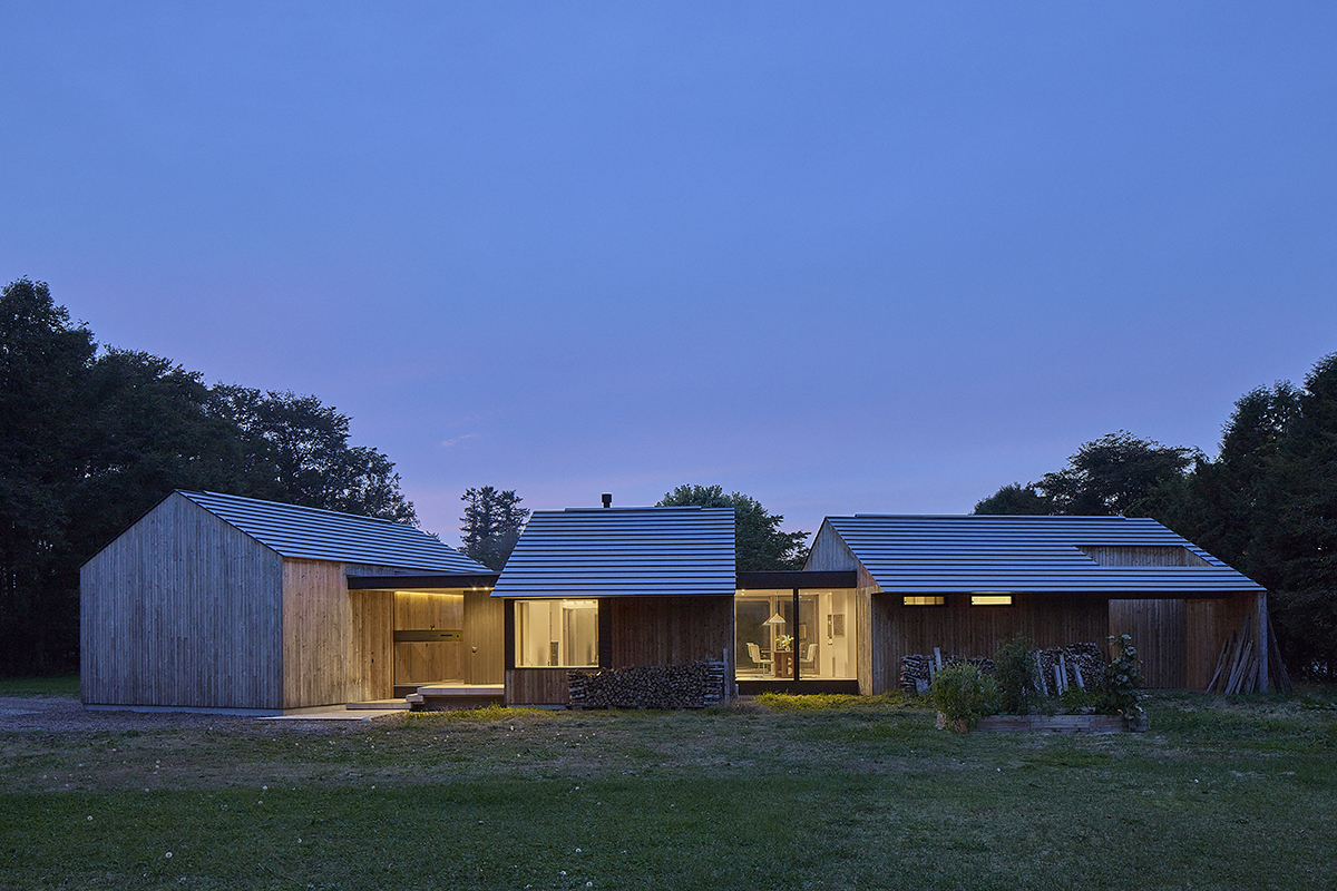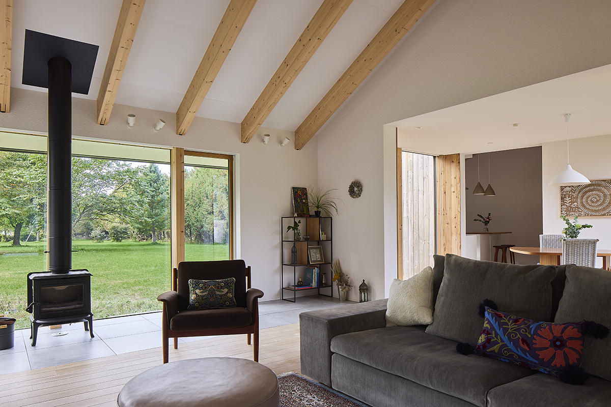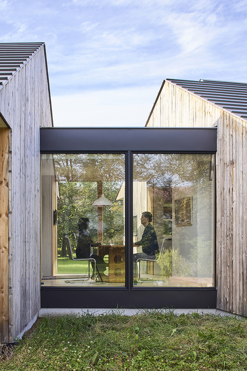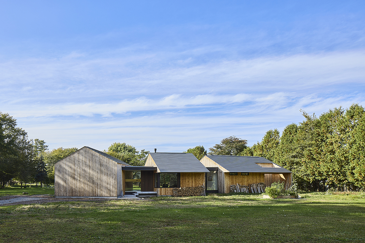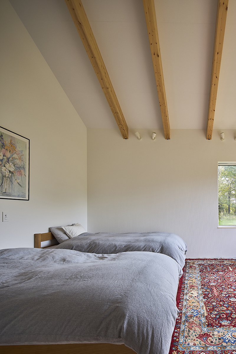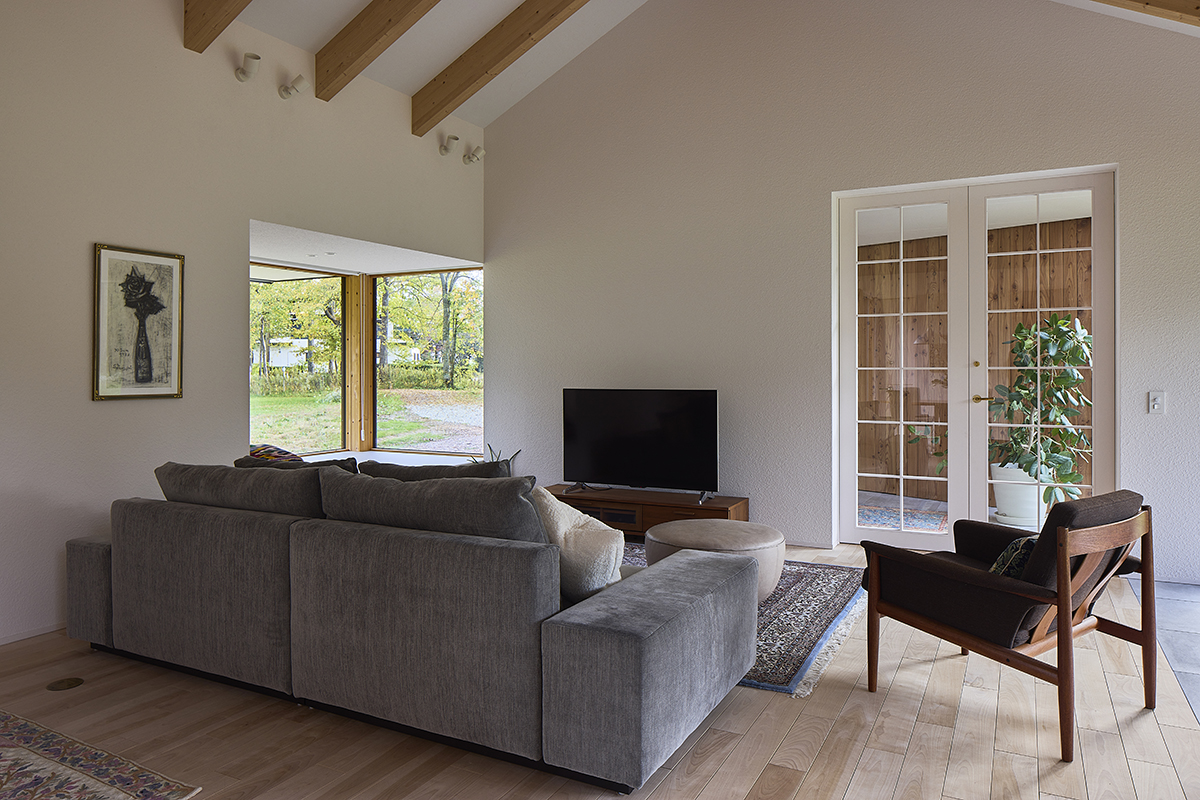 The Tokachi region is characterized by its relatively low snowfall and long hours of sunshine. Leveraging these advantages, the buildings feature triangular roofs ("Sankaku") equipped with solar panels, promoting the use of eco-friendly energy. Additionally, the structure is divided into three distinct spaces, each connected by transparent glass. This design fosters a sense of openness while seamlessly blending the living spaces with the surrounding natural environment.