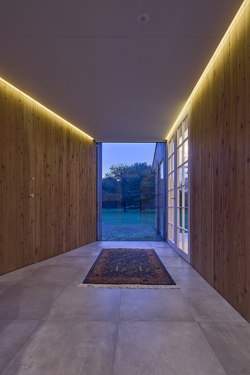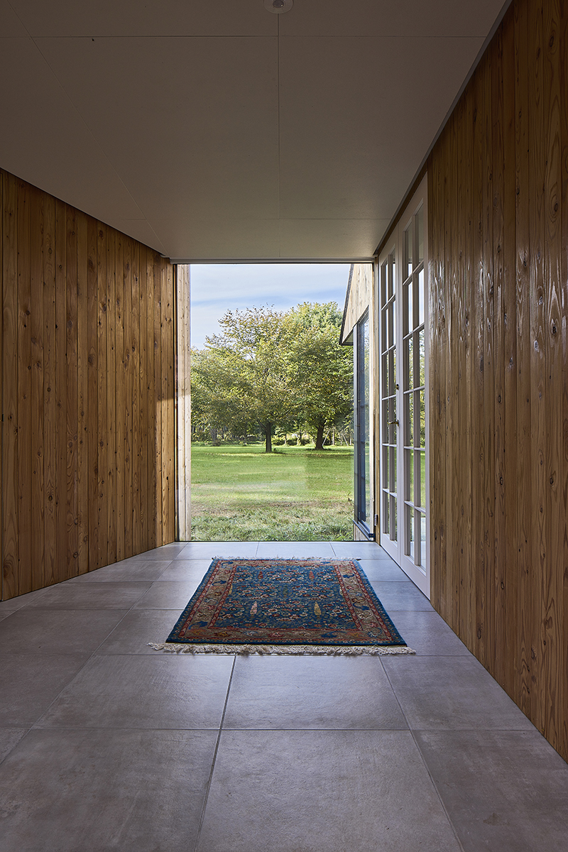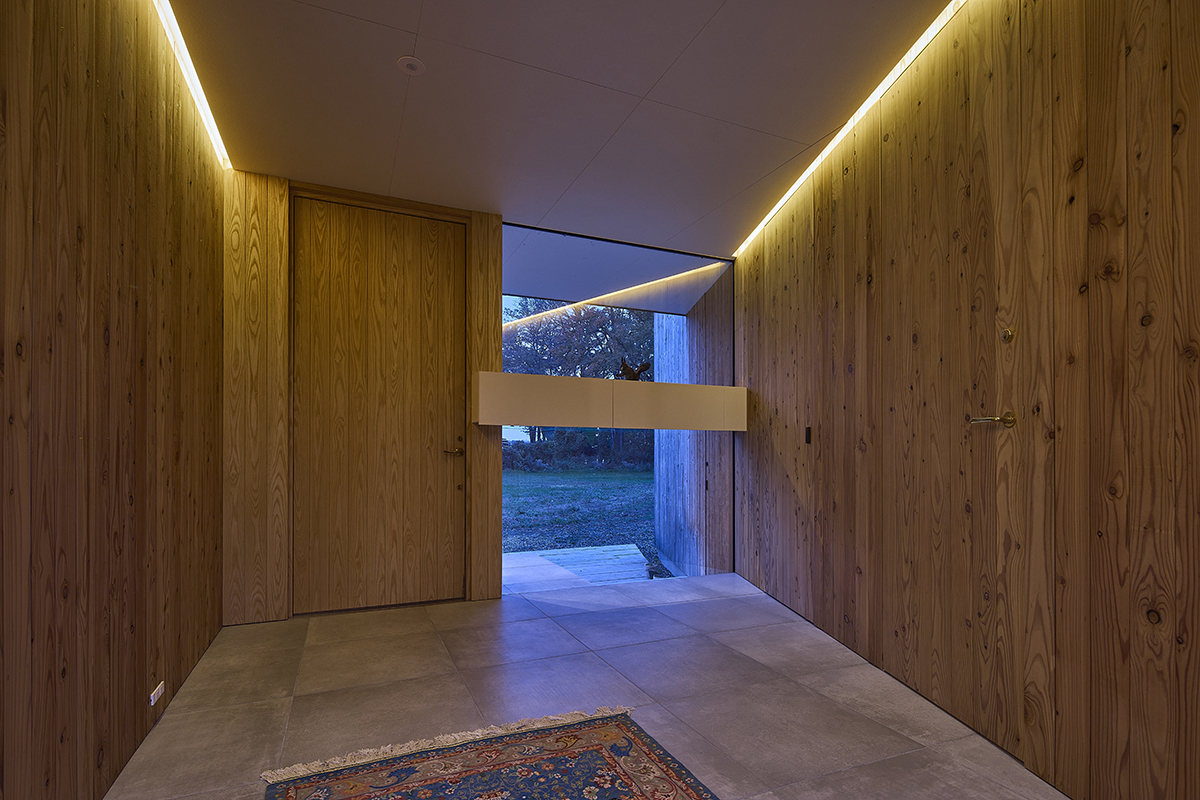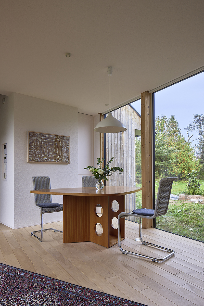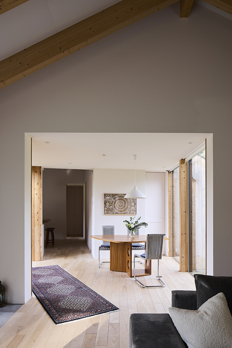 Upon entering the foyer, the first sight that greets visitors is the three symbolic trees. These trees serve as the defining feature of the residence, allowing the inhabitants to experience their presence from various angles throughout their daily lives. This design encourages a deep appreciation for the beauty of nature and the changing seasons. At times, the harsher aspects of nature are also felt, fostering a rich lifestyle intertwined with the natural world.