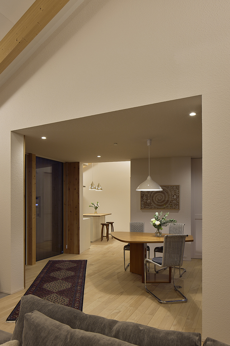 玄関ホールを訪れると、まず目に飛び込むのは3本のシンボリックな木々。これらの木々は住宅全体の象徴として機能し、住人は異なる角度からその存在を感じながら生活することで、自然の美しさや季節の移ろいを肌で感じることができます。時にはその厳しさも体感し、自然と共にある豊かな暮らしが実現します。