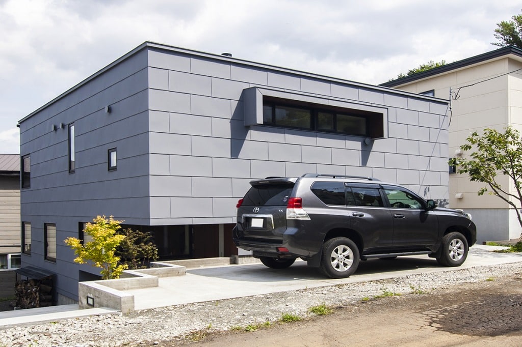 This home is located on a sloped site atop a gentle hill in Nishi Ward, Sapporo. The plot, which sits about half a level below the road, had remained unsold for several years due to its unconventional terrain—often avoided in typical property searches. However, this allowed the land to be purchased at a significantly reduced cost, saving several million yen. From the beginning, we worked closely with the homeowner in the land search, and the design evolved by making full use of the site's elevation difference.