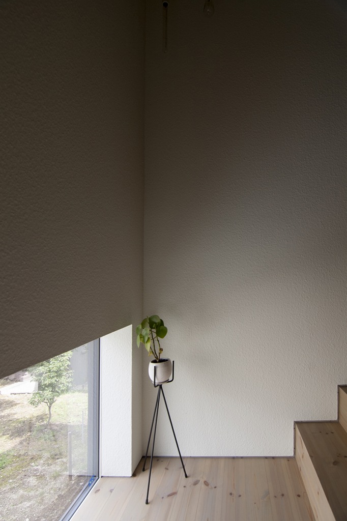 The building is designed with a skip-floor layout to match the slope of the site, allowing for a sense of expansive verticality despite the limited floor area. The second floor overhangs above the entrance, adding a three-dimensional accent to the exterior while providing an impressive and distinctive expression to the approach.
