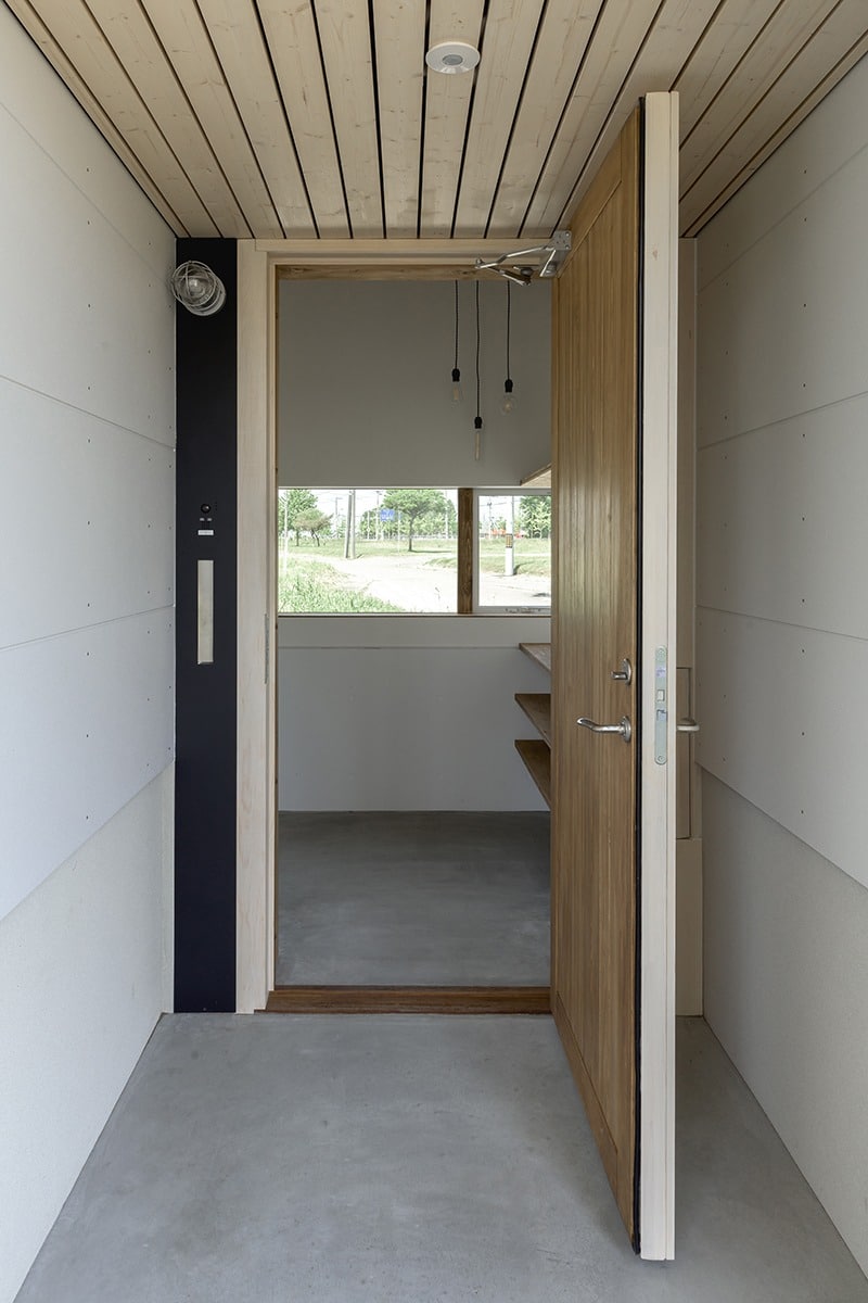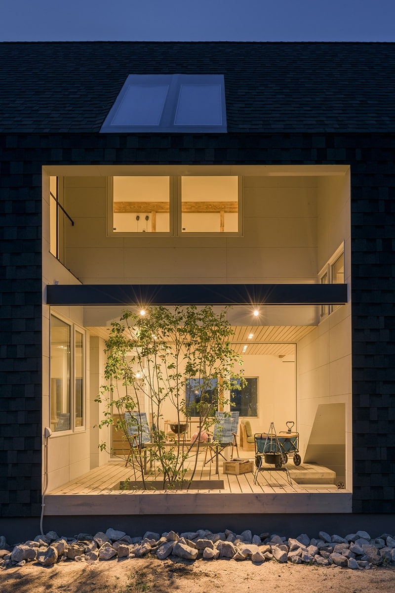 Nanporo Town is an agricultural hub, and to blend seamlessly with the landscape of houses and farms, the building adopts a simple "house form." A portion of the structure is carved out, allowing a wooden deck to slide in, adjusting the interior light environment while creating a connection between the interior and exterior. The living room connects to this carved-out wooden deck, creating an ambiguous indoor-outdoor space that feels as if the "inside and outside have reversed (inside-out)". This design invites the changing seasons of Hokkaido's natural beauty into the home, evoking a lifestyle akin to enjoying glamping.