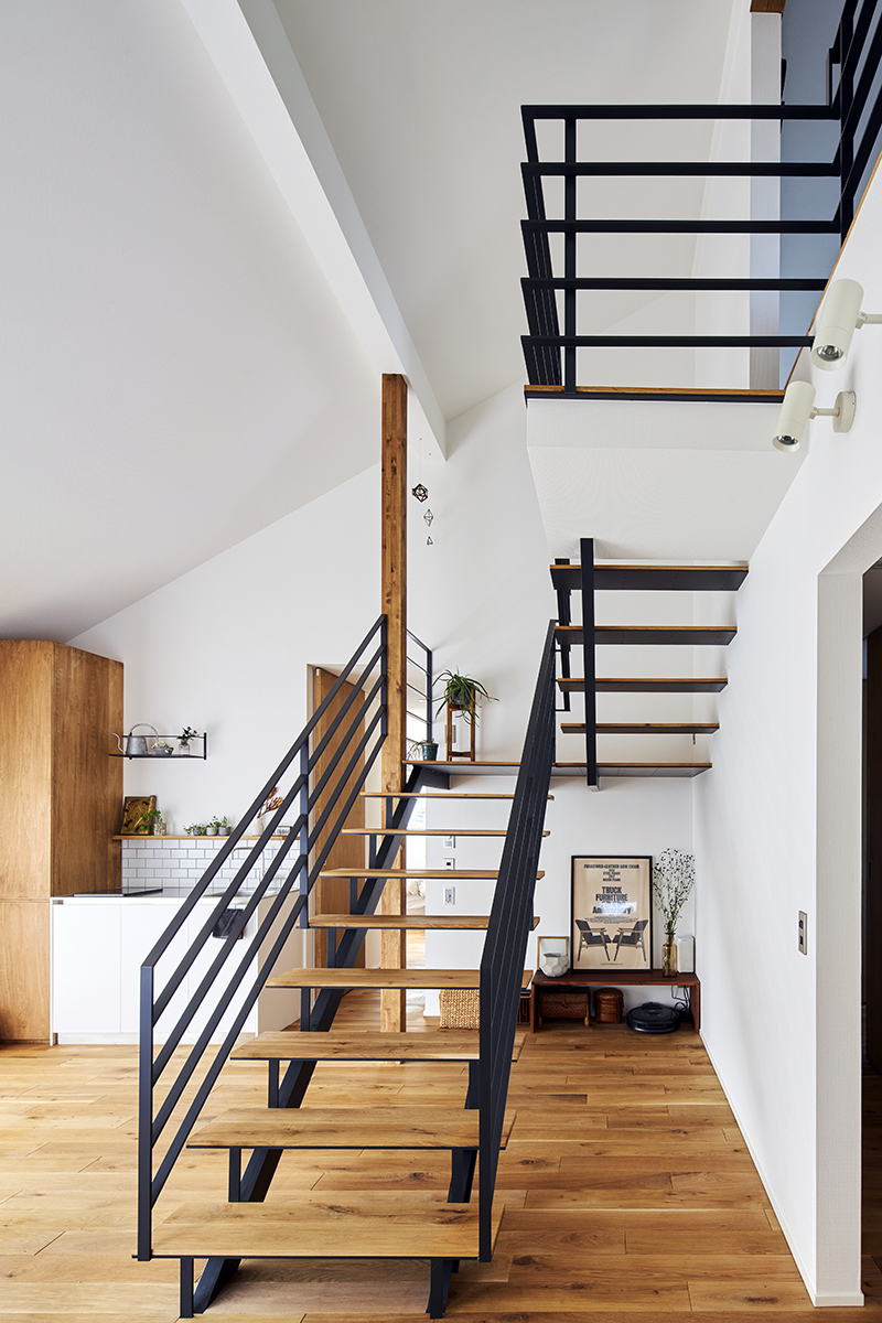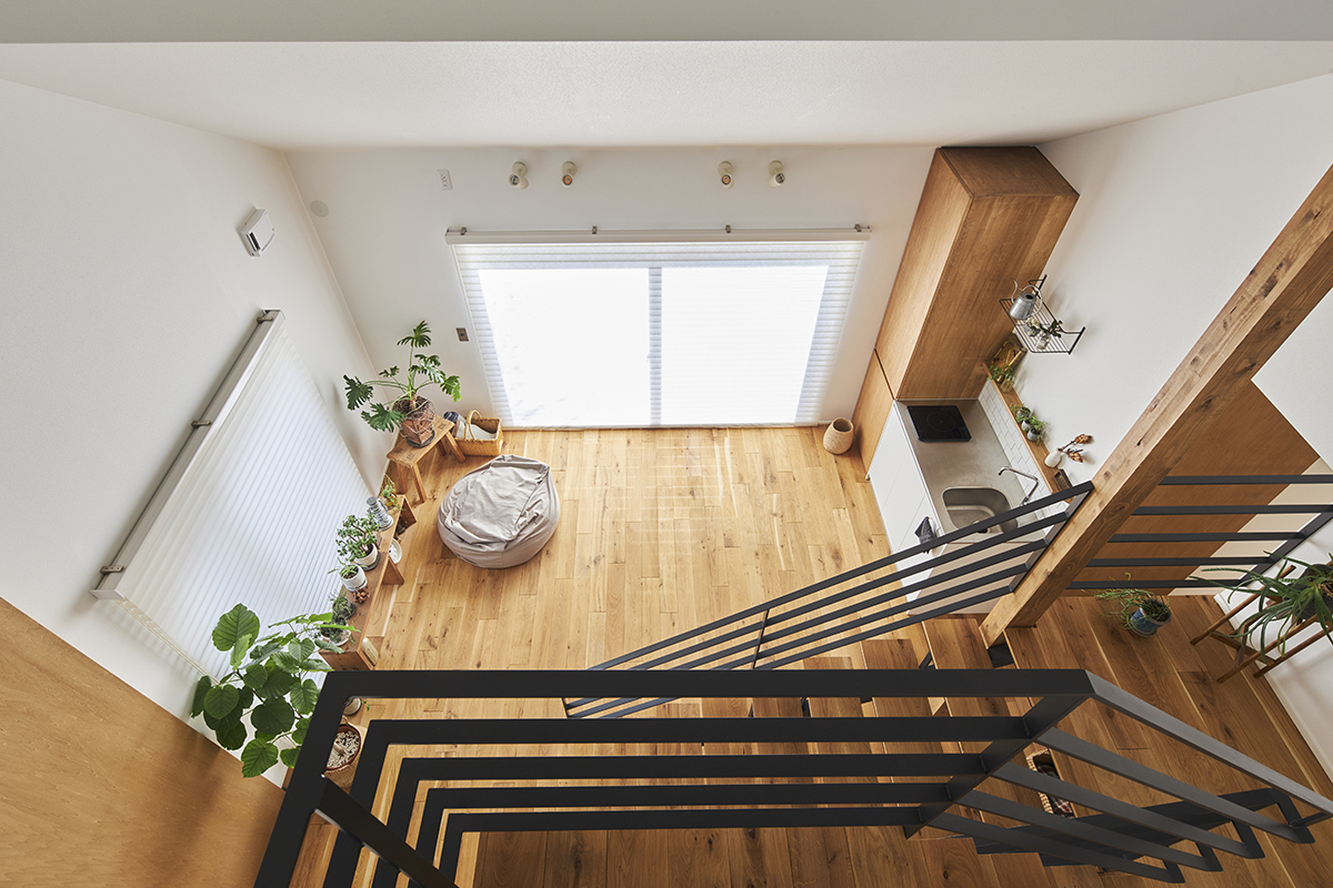 リフォームではリビング、ダイニング、キッチンを2階の北東に配置し、外の景色を楽しむことができる空間としました。また、西側に位置する吹き抜けからは、反射光が優しく室内を包み込む設計としています。この光により、空間全体が温かみのある心地よい雰囲気に包まれます。