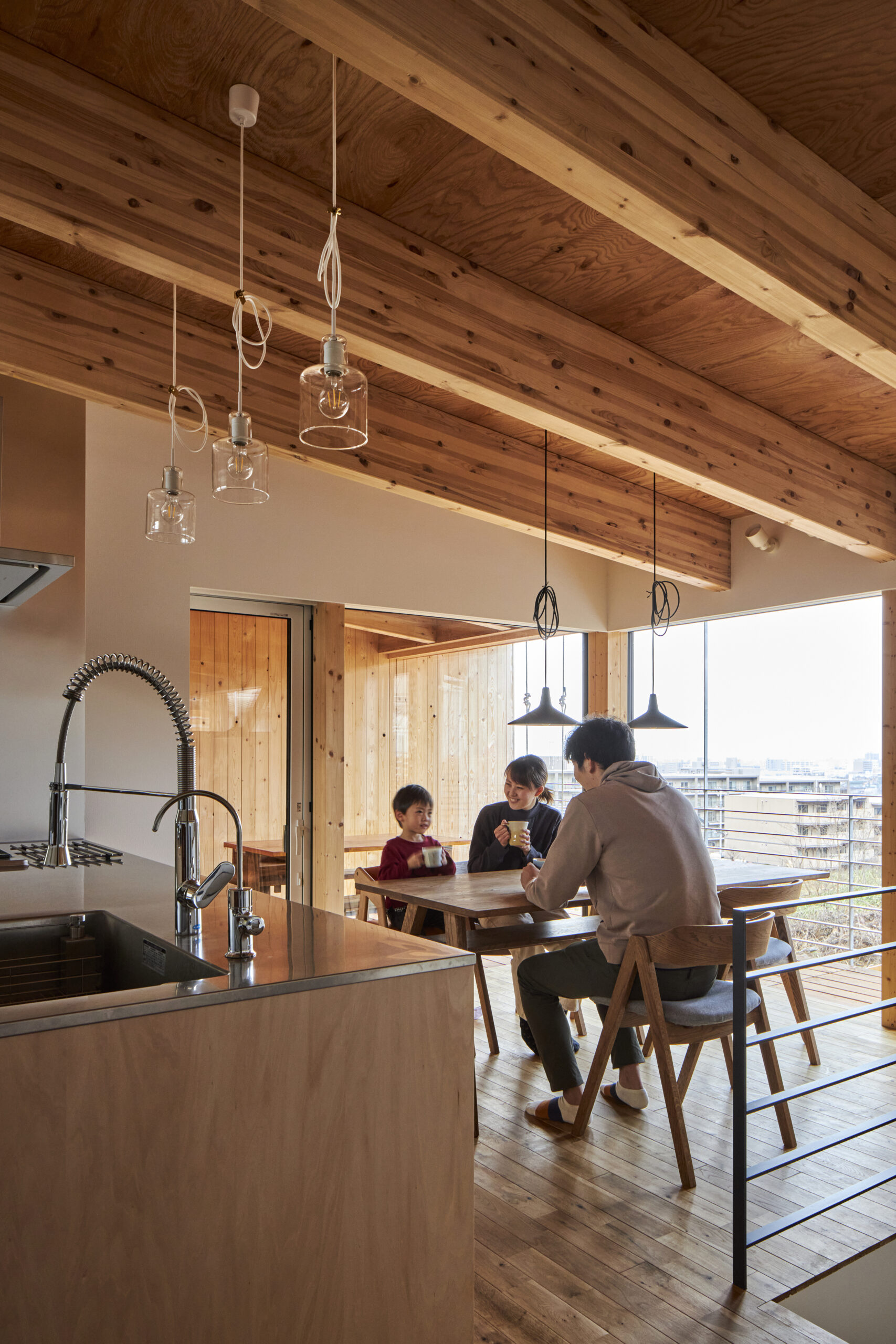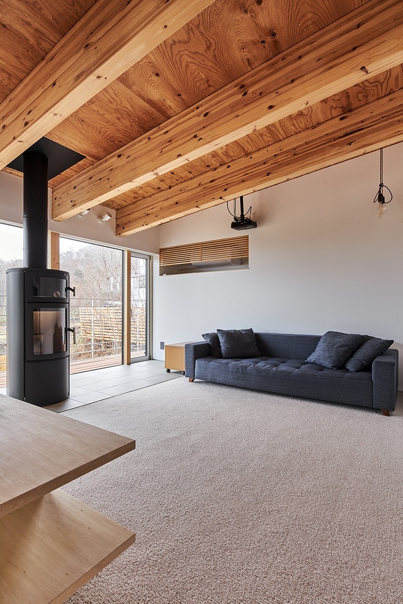 室内は屋根形状や構造を素直に表現し、自然の素材感を活かした仕上げとしました。これにより、空間全体が家族を大らかに包み込み温かみを生み出します。さらに、2階に設けた大きく張り出したバルコニーは、光を反射し、天井の梁に柔らかな明るさを与え、空間に潤いを加えます、それにより、住人の生活に潤いを与える様に考えました。
