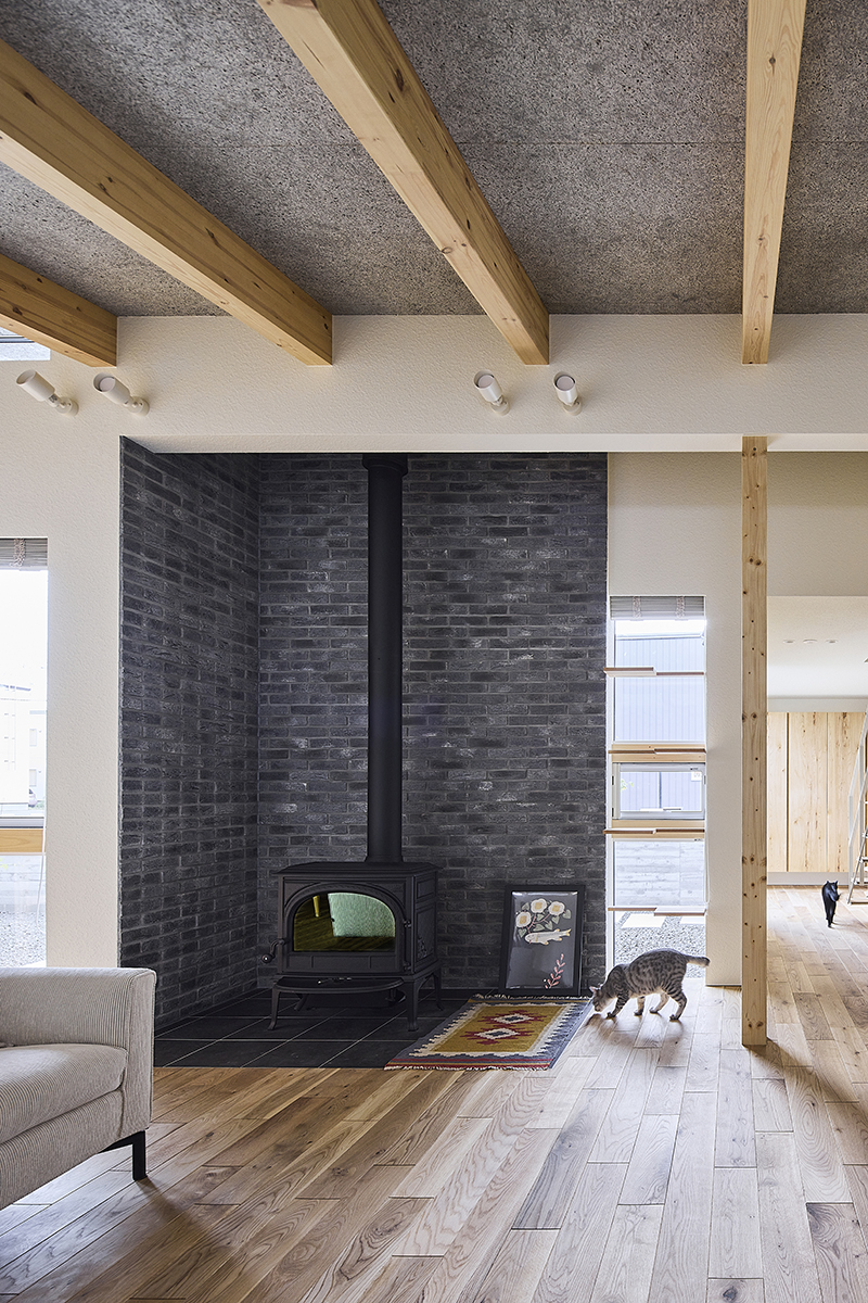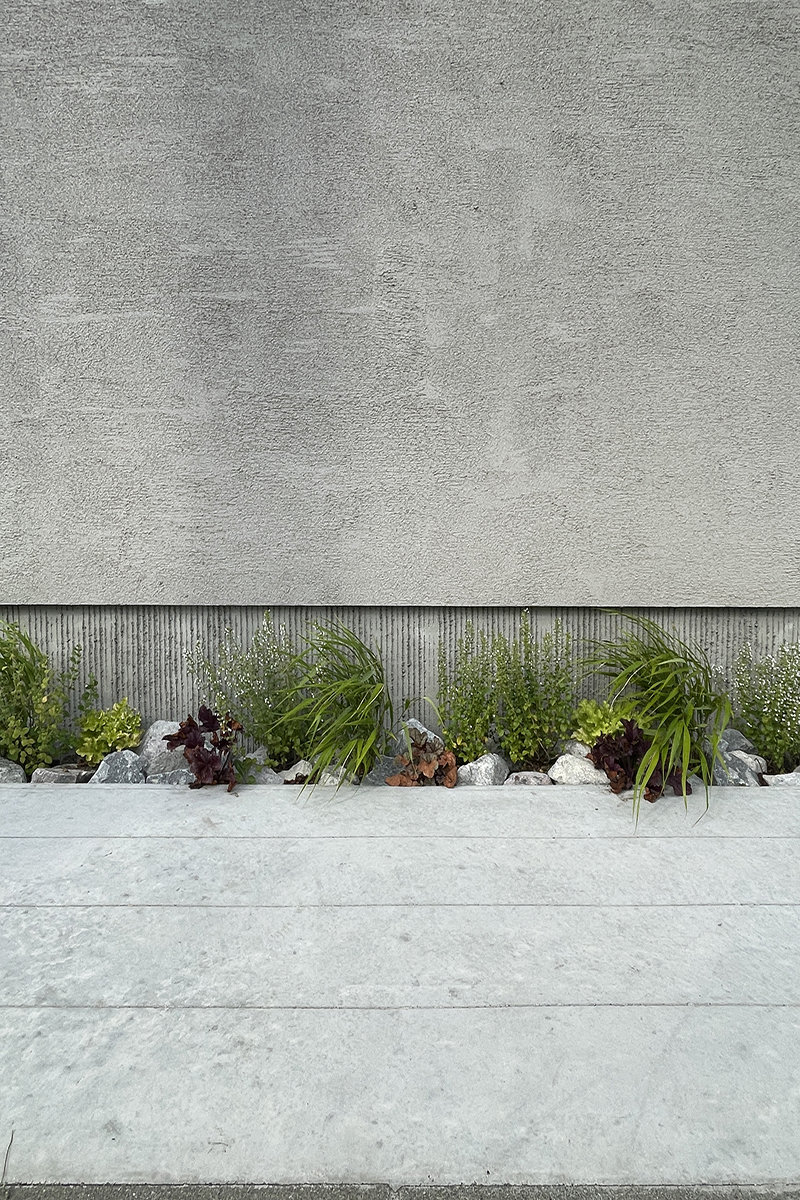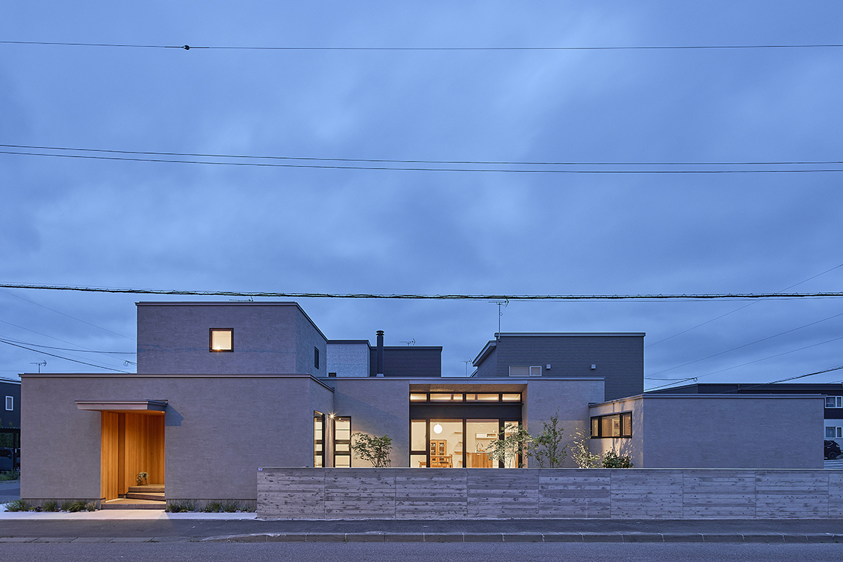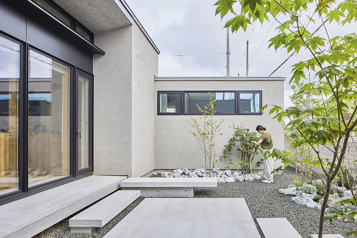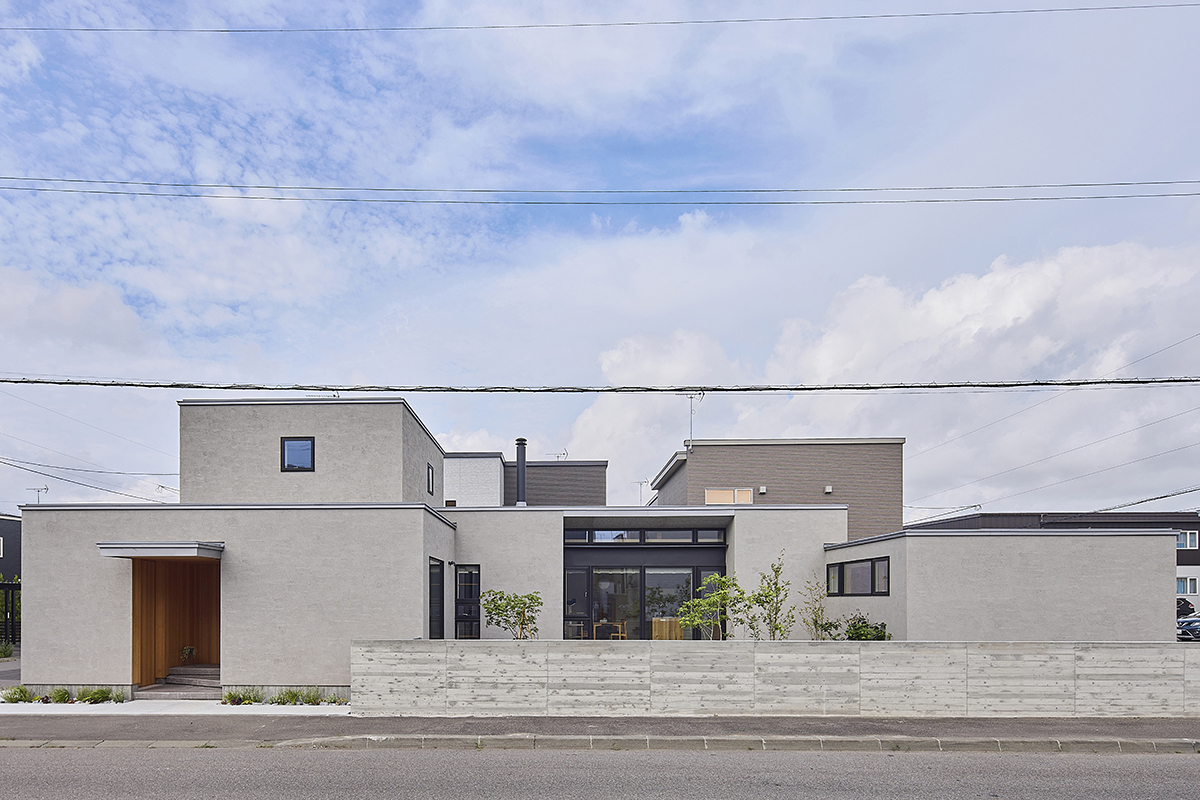 "The House of Scenery" is located in a residential area in Chitose, Hokkaido. The property is long from east to west, with the southern side facing a road. Rather than blocking external views forcefully, the design harmonizes with the surrounding environment by adopting a courtyard house layout. Greenery is placed along the roadside, with the intention that, over time, the plants will soften the view and provide a natural barrier.