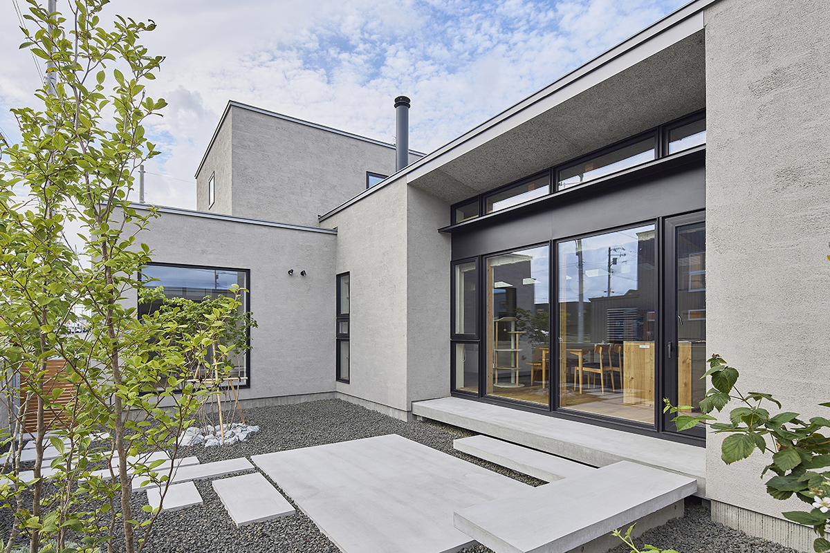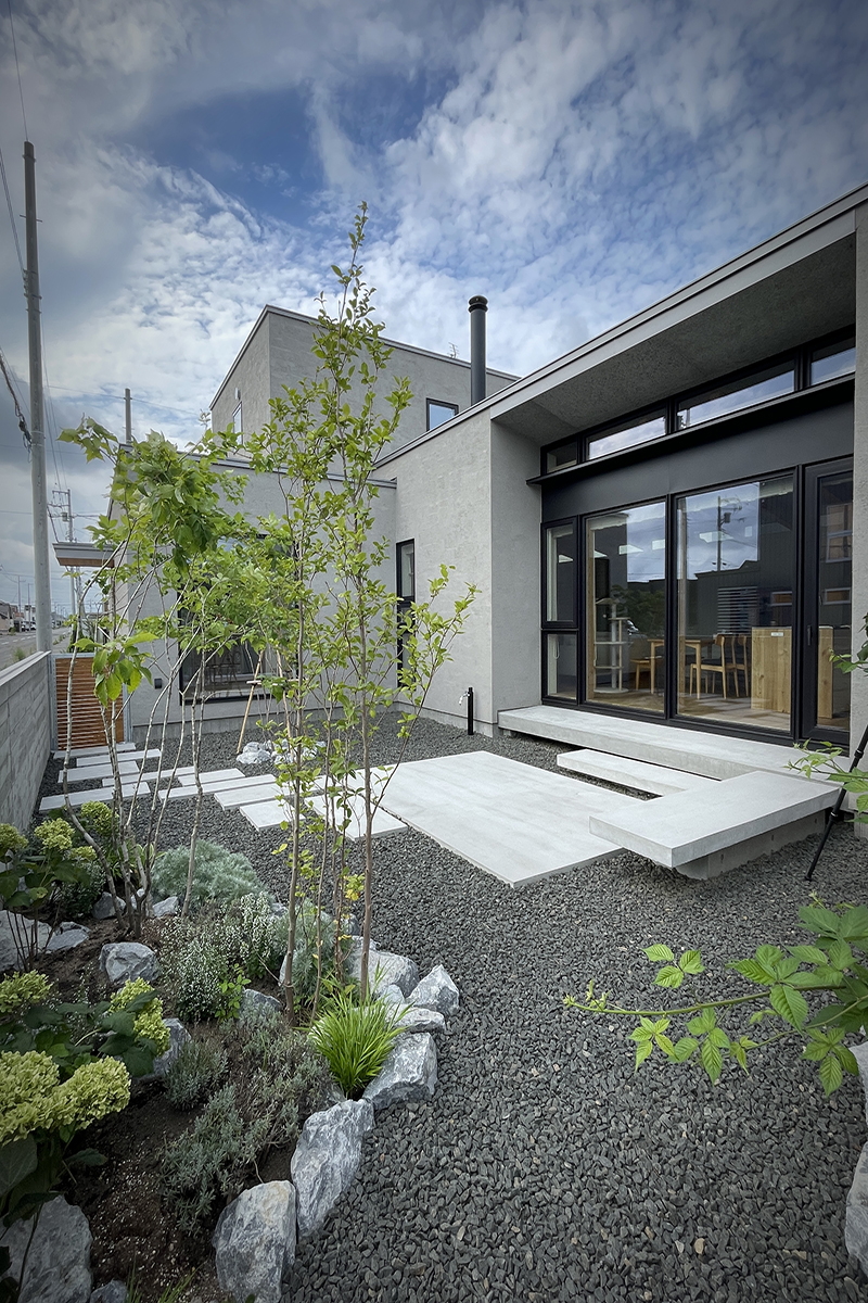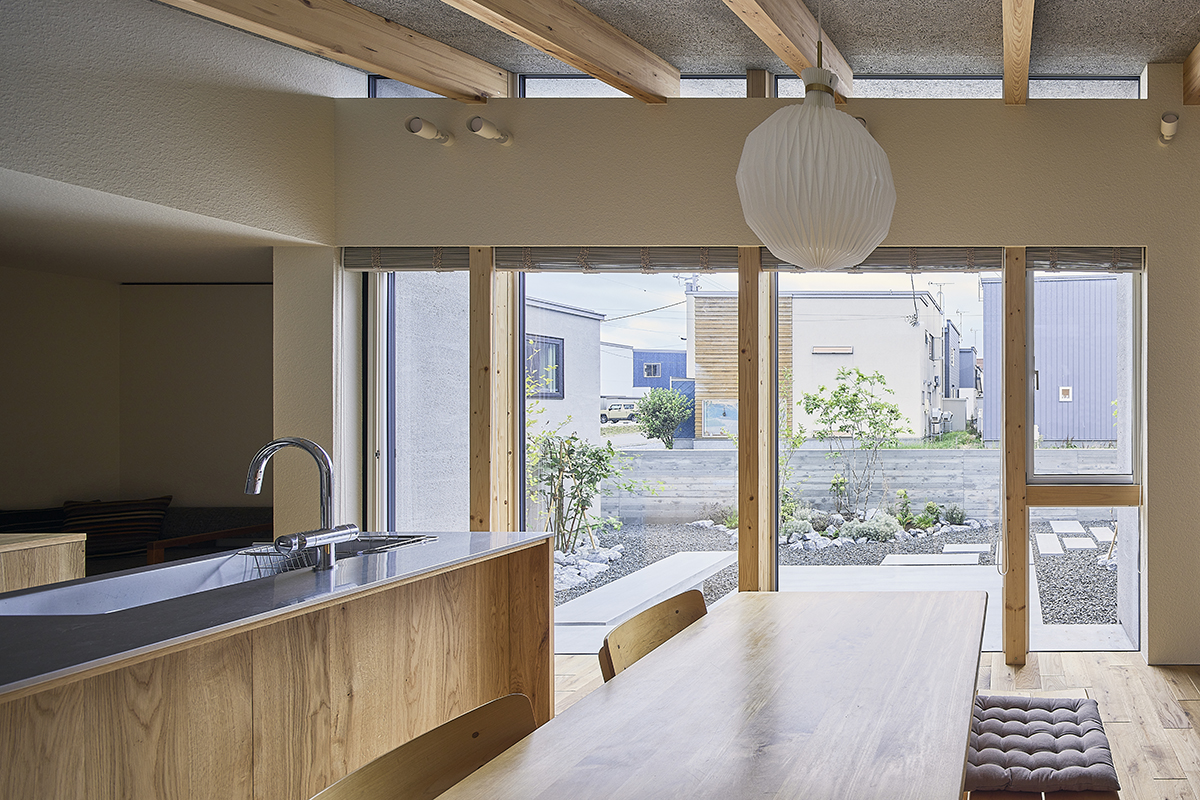光景の家は、北海道千歳市の住宅街に位置し。敷地は東西に長く、南側は道路に面しています。周囲の環境に調和し、外部からの視線を無理に遮るのではなく、コートハウスとしてデザインし、道路側には緑を配置しています。これにより、将来的には緑が視界を柔らかく遮ることを意図しています。