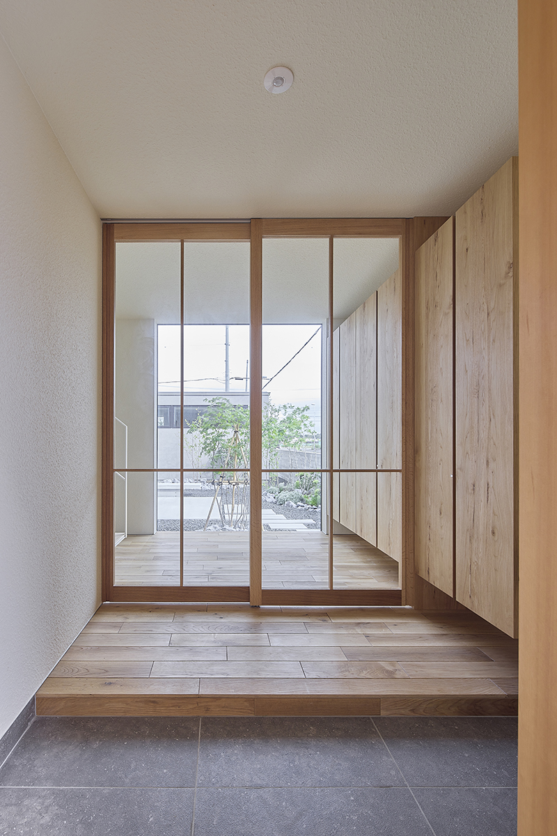 The exterior walls are finished with plaster, emphasizing a rough texture that imparts a sense of solidity and weight. The entrance approach, along with the foyer and hallway, features a lowered ceiling, creating a space that gently envelops visitors. This design provides both residents and visitors with a pleasant and calming impression, expanding into a serene atmosphere throughout the home.