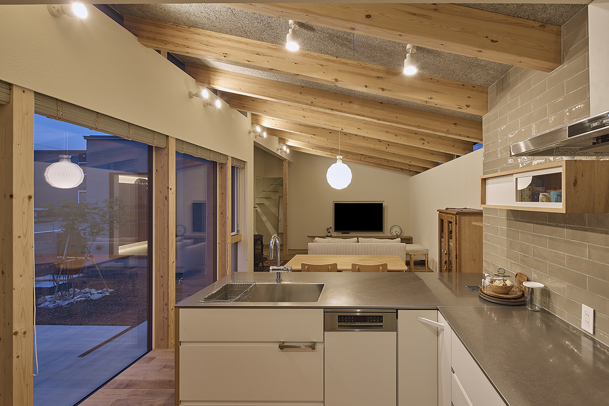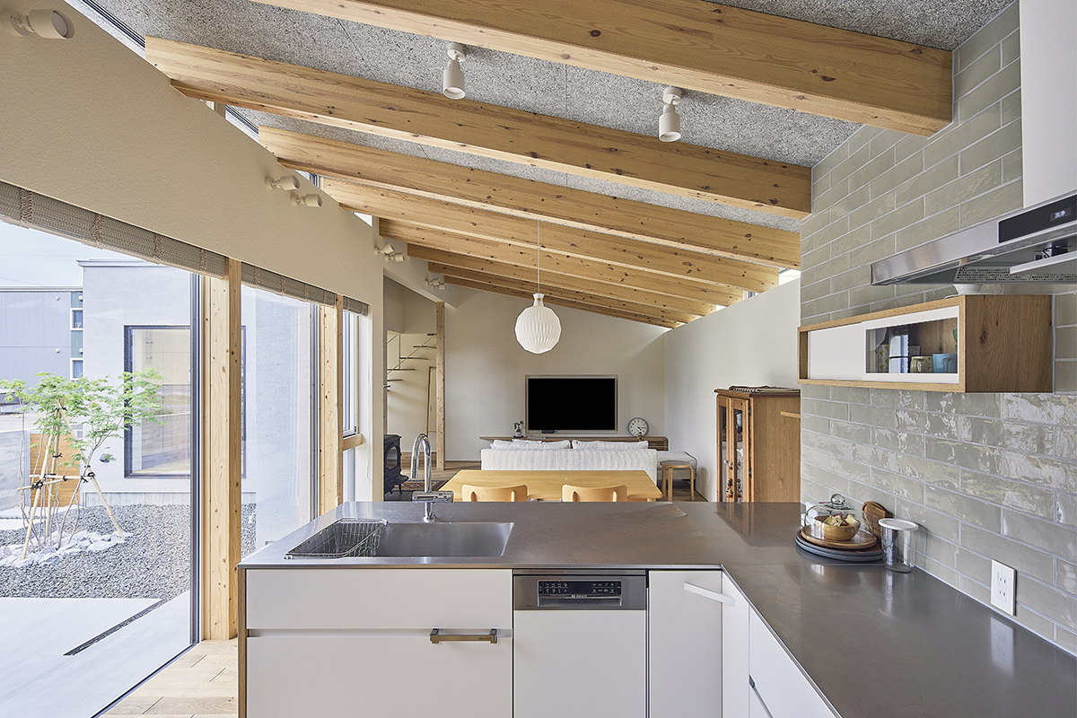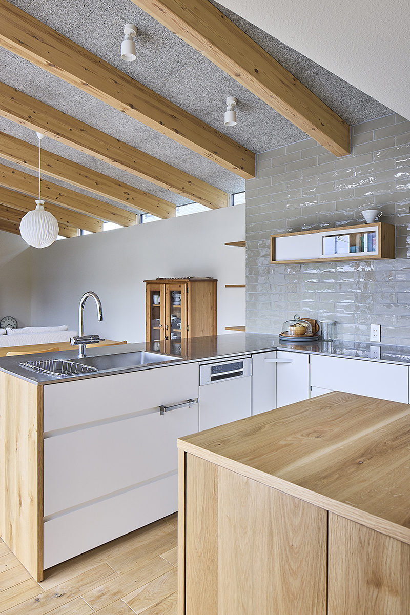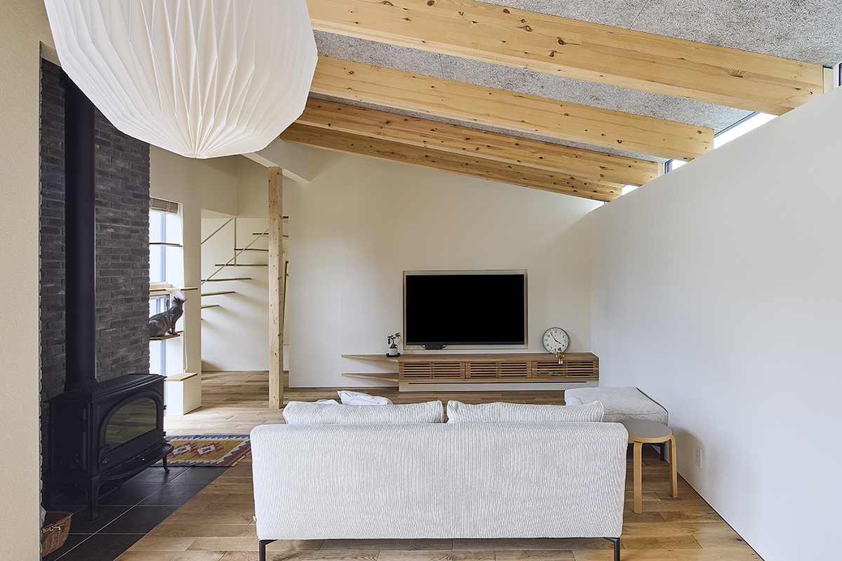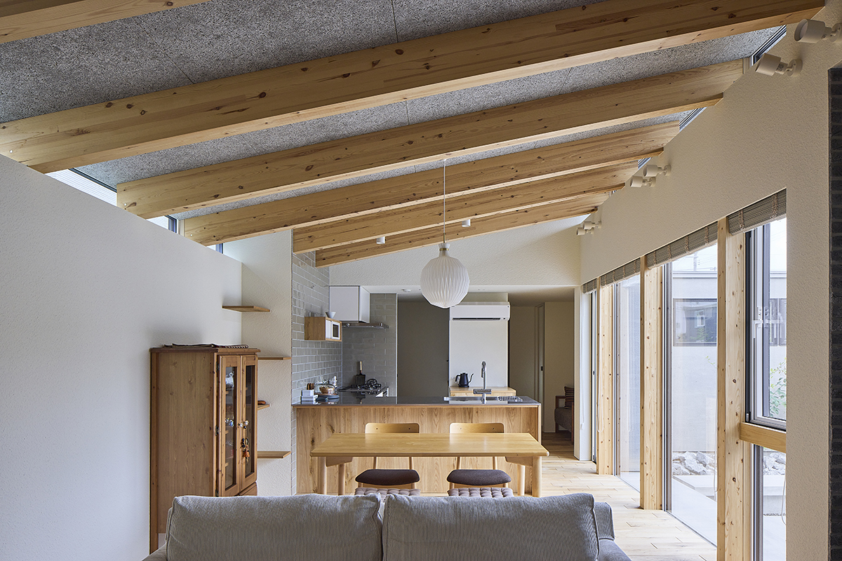 玄関ホールを抜けると、空間の天井が上がり、緩やかに傾斜した天井の梁から光が差し込むデザインとしました。この天井の質感によって光が拡散され、柔らかな光が空間全体に広がります。住人や訪れる人々は、この穏やかな光に包まれ、心地よい時間を過ごすことができるように設計しています。