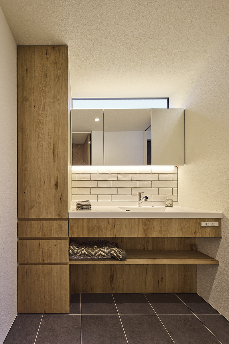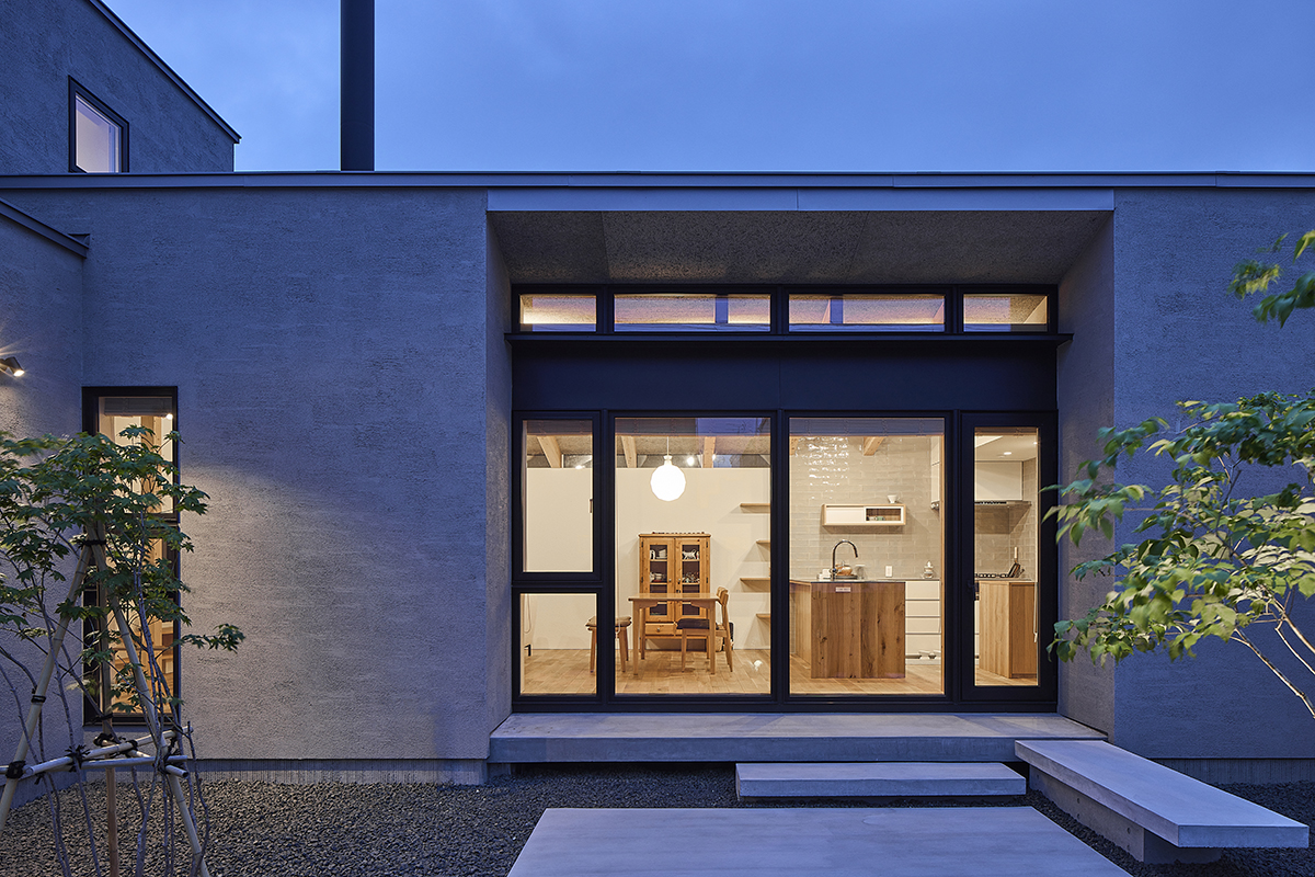 外壁は塗り壁仕上とし、荒い質感を際立たせて重厚感を与えた。玄関アプローチから玄関、ホールにかけては空間を低く抑え、訪れる人々を柔らかく包み込む空間としています。これにより、住人と訪問者に心地よい印象を与え、落ち着きのある空間が広がります。