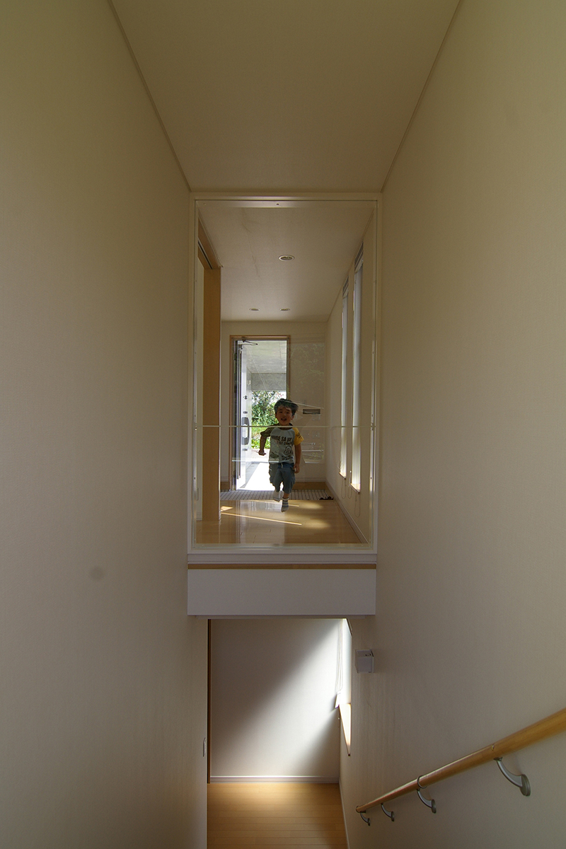 車庫スラブを持ち出し、ブリッジとして玄関へと接続することで、構造的合理性と体験的価値を両立させている。