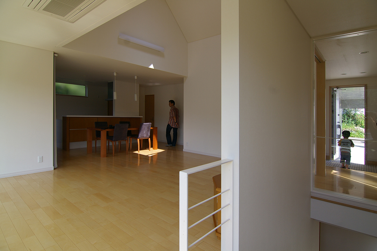 居間からは遠景の山の緑が広がり、自然が室内の構成要素となる。