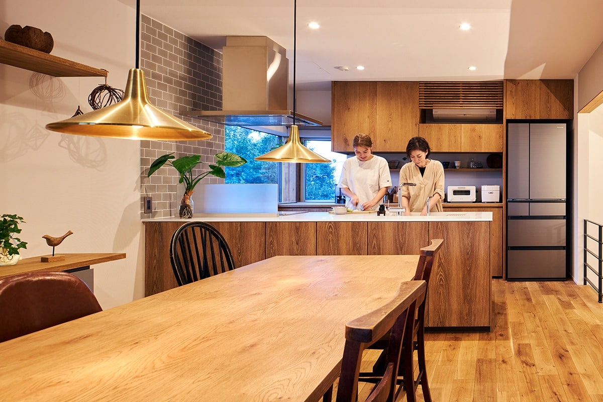 リフォームではリビング、ダイニング、キッチンを2階の北東に配置し、外の景色を楽しむことができる空間としました。また、西側に位置する吹き抜けからは、反射光が優しく室内を包み込む設計としています。この光により、空間全体が温かみのある心地よい雰囲気に包まれます。