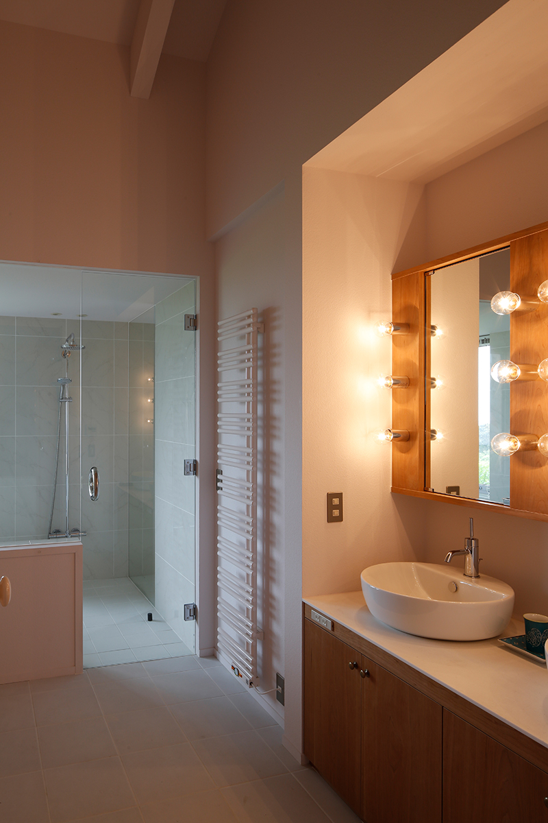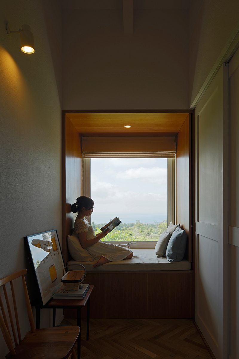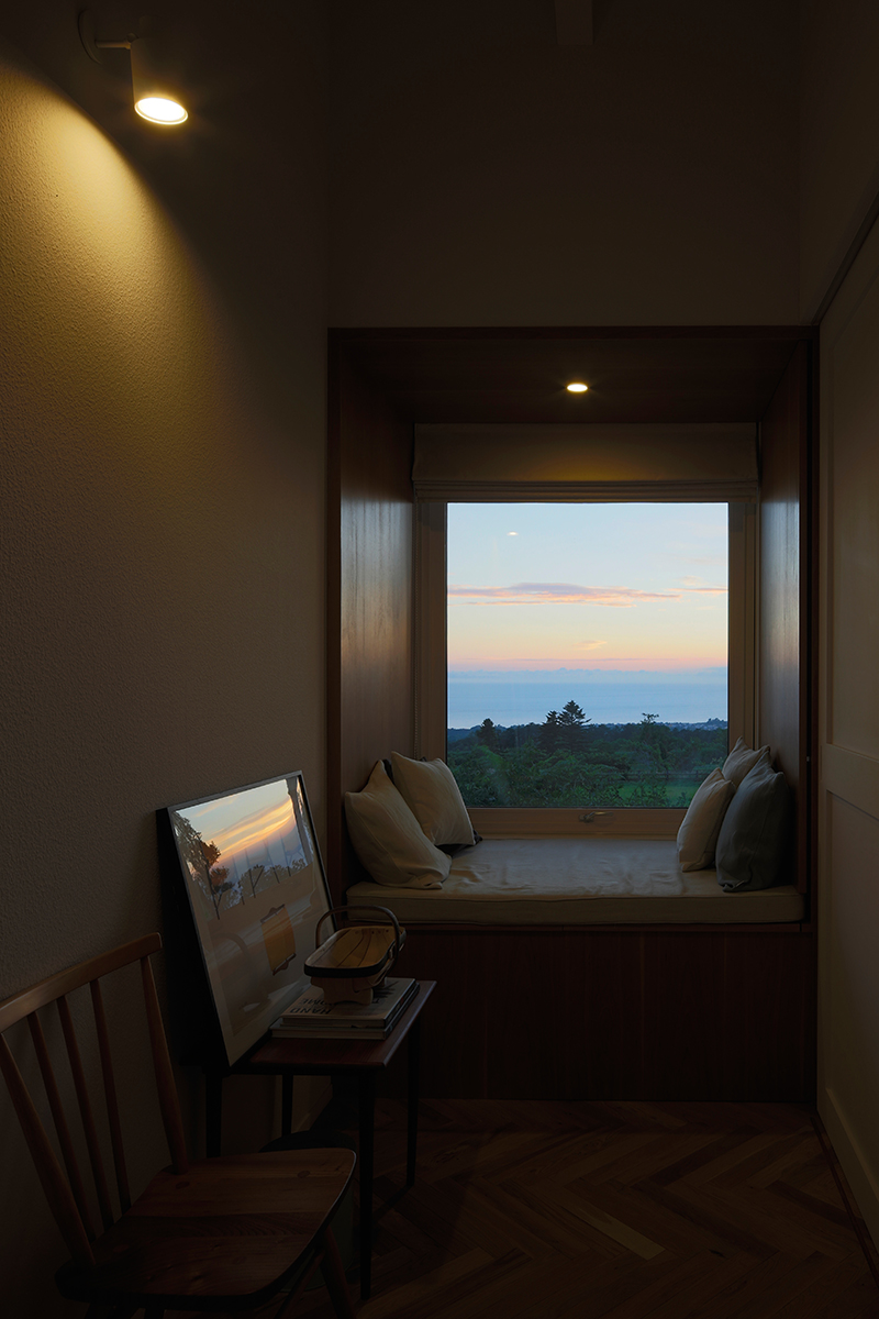 A subtle hint of red is mixed into the white paint, allowing the sunset over Uchiura Bay to interact with the interior, gently tinting the space pink at dusk.