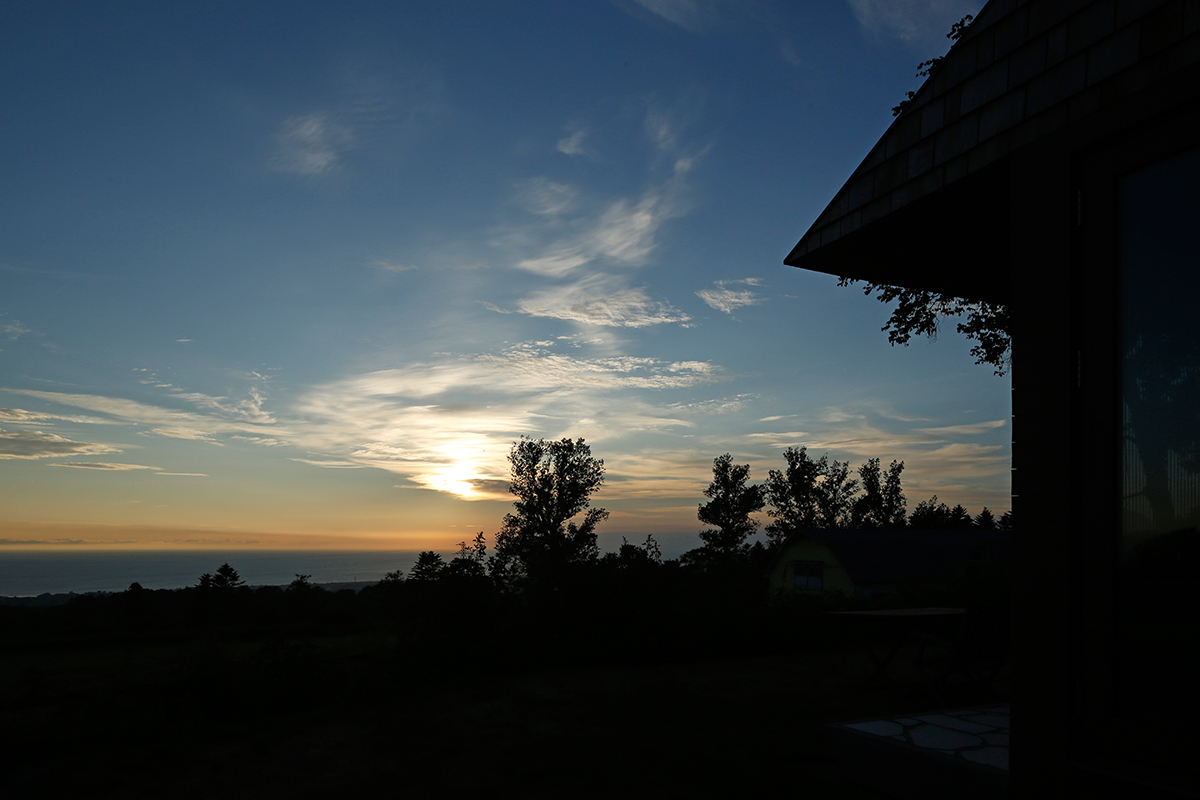 内浦湾に沈む夕日が室内と呼応し、