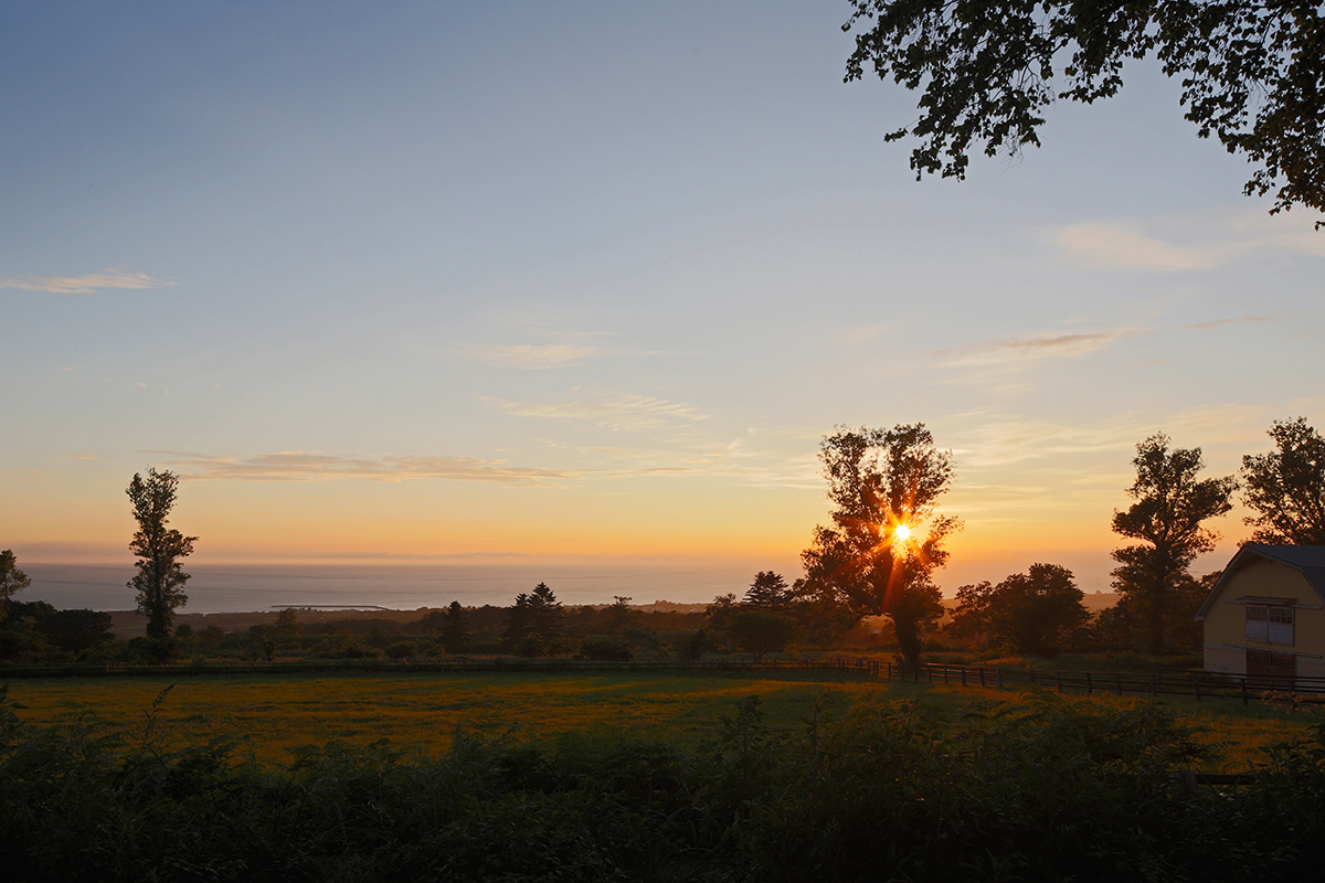 牧草の広がる大地、その先に内浦湾、